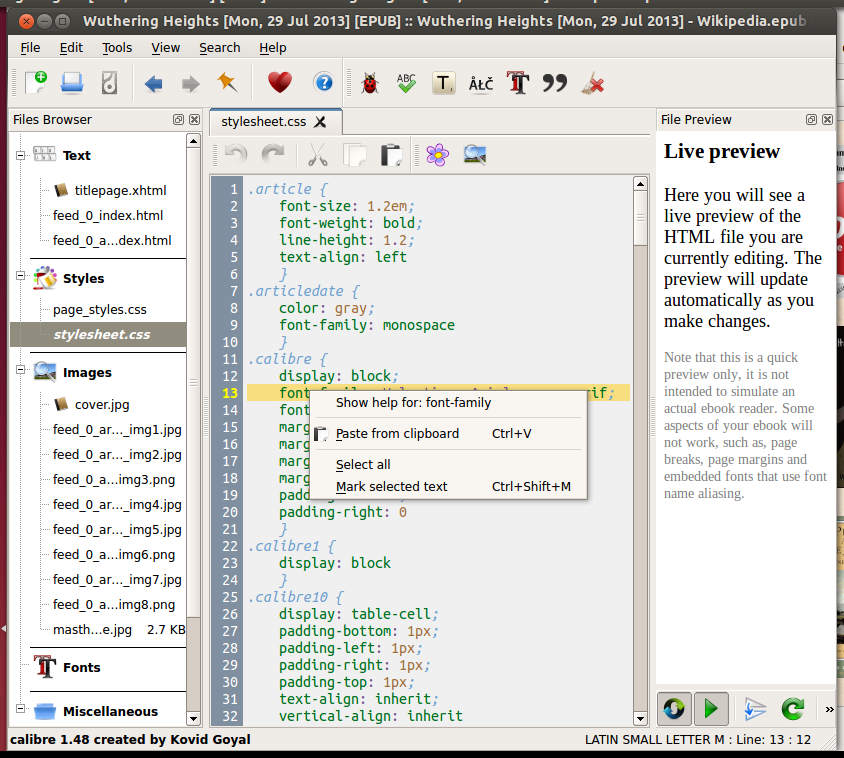 Now, you can right click on any HTML/OPF/NCX tag name or CSS property and the editor will open some help for that item in your browse. For example if you right-click on the font family CSS property you will see: