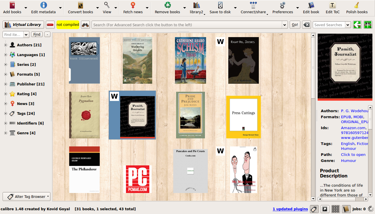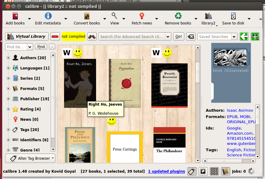 In the above picture the books by Wodehouse, which I have also tagged as humor have both icons of "W" and the smiley face on top. The book "Press Cuttings", is not by Wodehouse, but is tagged as a satire has only the smiley face icon. The location of the icon/s is not on the left as shown for the books by Wodehouse two pictures ago but on top.