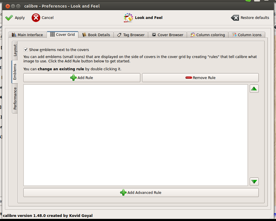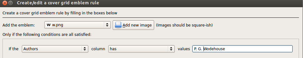 Since version 1.47, user defined emblems (icons) can be displayed next to covers in the cover grid mode. This is similar to the column icons feature introduced in version 0.9.17 discussed in this post.You can have your own custom icons displayed next to covers in the cover grid, based on simple rules you create. To create these rules go to Preferences->Cover Grid and click the Emblems tab on the left and you see the following window: